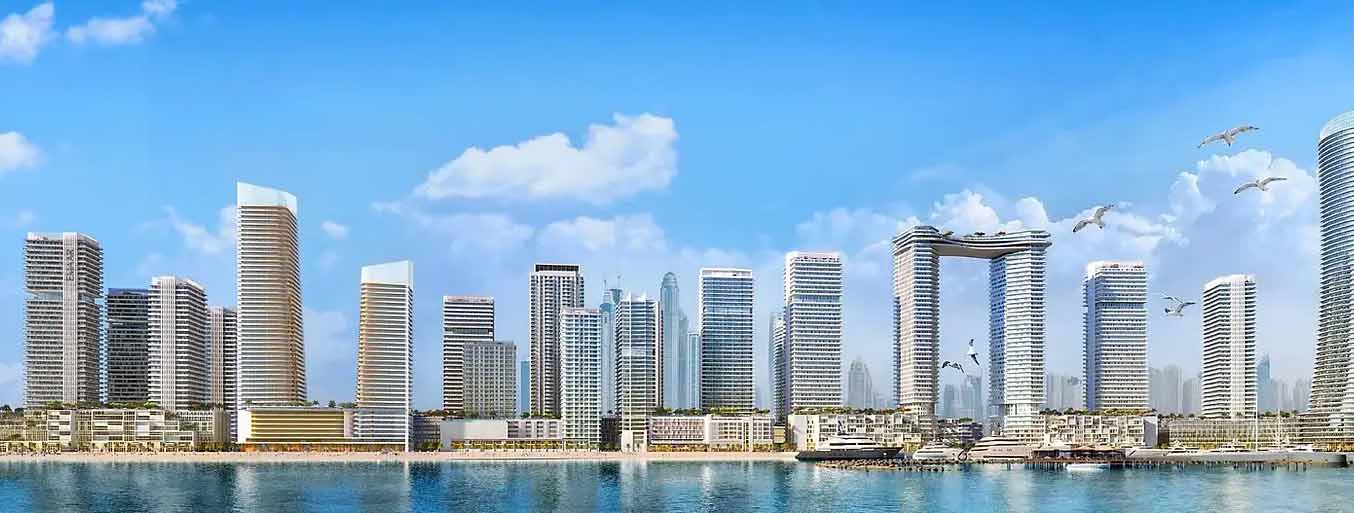 Emaar Beachfront is a 10 million sq. ft gated community in Dubai Harbour by Emaar Properties. Emaar Beachfront is a master development that will feature 24 residential towers, offering 1-4 BR apartments, 3-4 BR penthouses and podium villas. The residents can use hotel services by Address Hotels + Resorts and also 1.5KM Private Beach. Most apartments in Emaar Beachfront also offer sea views and the view of the Majestic Dubai Marina Skyline. The project was launched in 2018 and has the first show apartments in Beach Vista and Sunrise Bay.